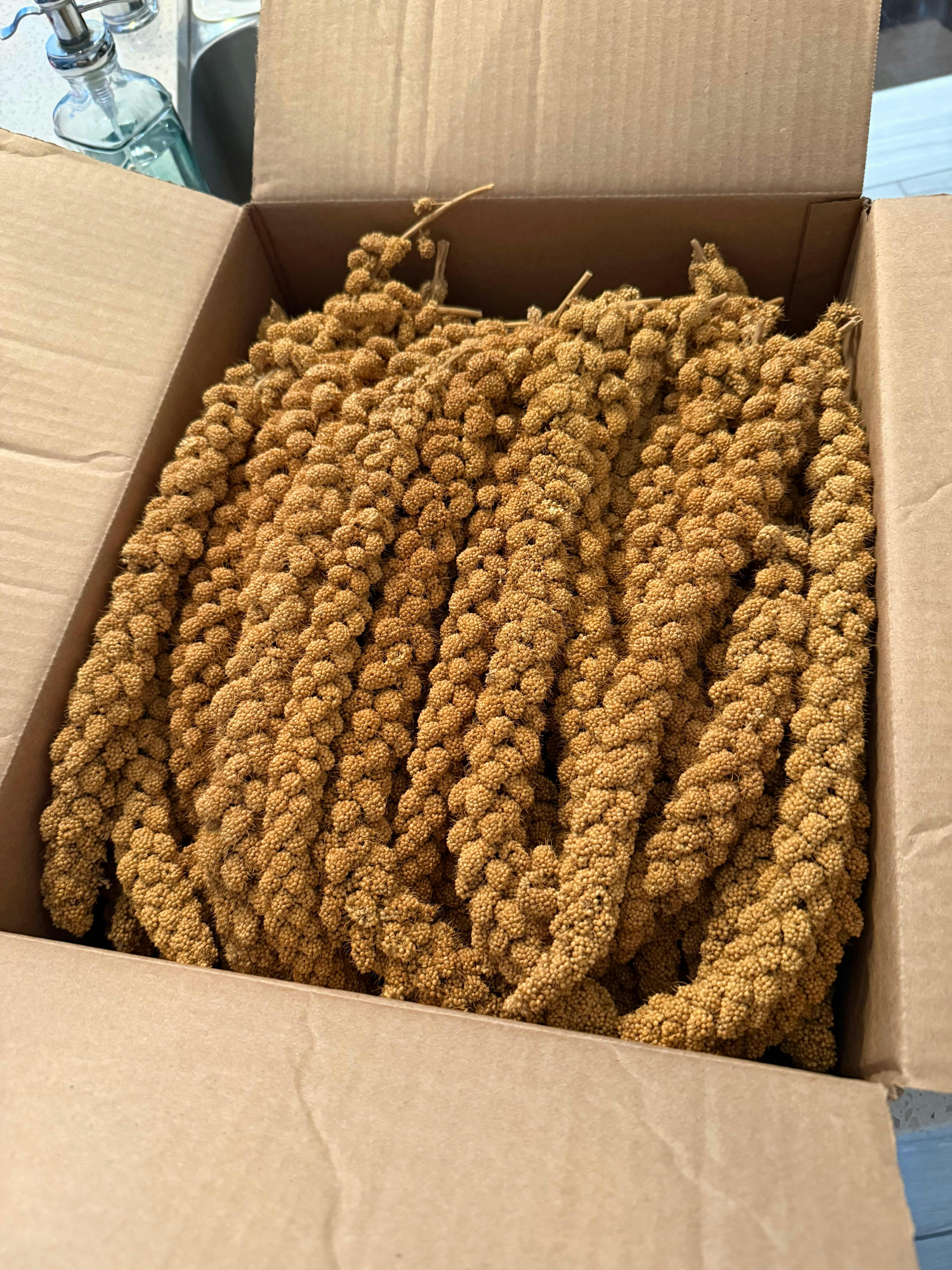 Relatively uniform appearance - A grade millet that is at least 10" long. This is a crop and there may be some variety between any two pieces or boxes. You will still receive 20lb of 10"+ spray millet.